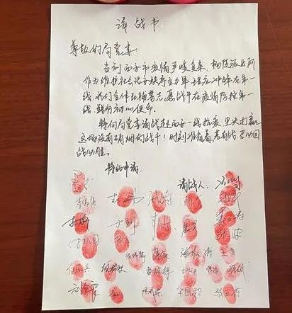 “尊敬的局党委:当前,疫情严峻复杂,杨陵派出所作为维护社会治安秩序主力军理应冲锋在疫情防控第一线。我们全体民辅警志愿在疫情防控最艰苦、最复杂的一线工作,践行初心使命……”2021年12月28日一大早,杨陵派出所所长上班后第一件事就是坐在办公室奋笔写下“请战书”,所内民辅警得知这件事后,纷纷带头报名,在请战书上签下自己的名字。