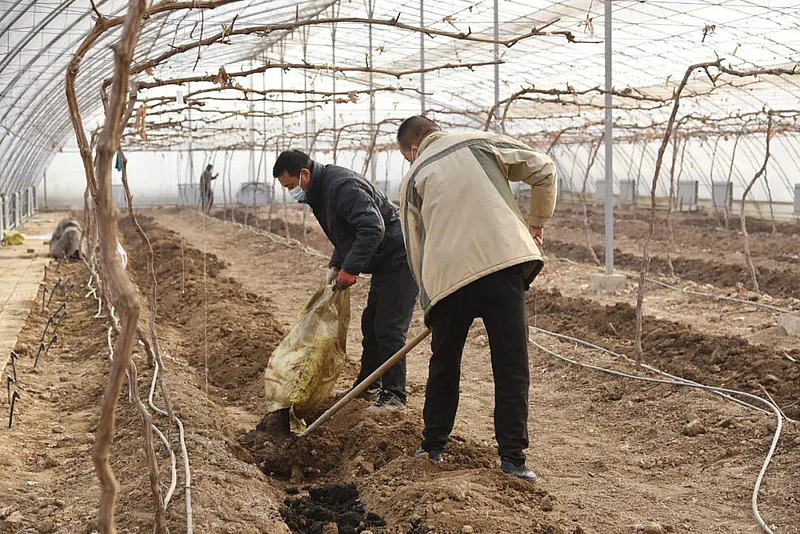 1月3日,一大早,记者来到了位于五泉镇的杨凌旺丰园果蔬专业合作社,大棚里工人正在给葡萄树施肥。