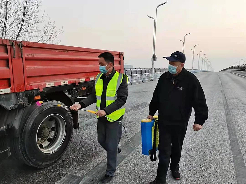 “除检查登记外,对于运输车辆更要严格消杀。”只见工作人员手提消毒喷洒机,正在对车辆进行仔细严谨的消杀,寒风吹过,消杀的水雾会回吹到手上,在冷风中,即使戴着手套,依旧冰冷刺骨,手僵了、脸紫了、耳朵没了知觉,但他们仍以昂扬的斗志和饱满的工作状态,坚守岗位。
