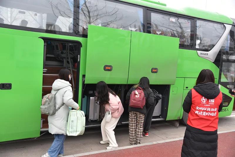 1月22日上午,一辆满载着归乡思切的西安电子科技大学学生的大巴停靠在西宝高速杨凌东出口的返杨学生接待点。