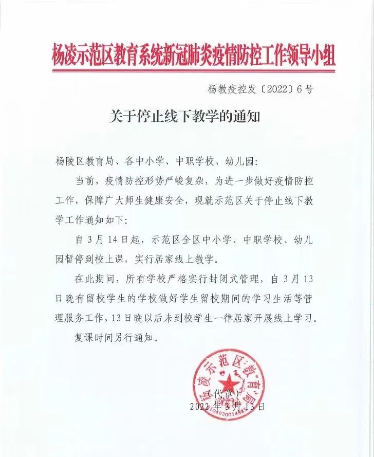 记者从杨凌示范区教育系统新冠肺炎疫情防控工作领导小组了解到,从3月14日起,示范区全区中小学、中职学校、幼儿园暂停到校上课,实行居家线上教学。