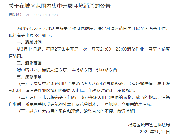 今天上午,杨陵区城市管理执法局发出重要通告 。从今天开始,将在城区范围内开展全面消杀工作,直至本轮疫情结束。