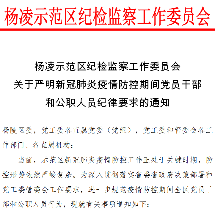 当前,示范区新冠肺炎疫情防控工作正处于关键时期,防控形势依然严峻复杂。为深入贯彻落实省委省政府决策部署和党工委管委会工作要求,进一步规范疫情防控期间全区党员干部和公职人员行为,3月15日,杨凌示范区纪检监察工作委员会下发《关于严明新冠肺炎疫情防控期间党员干部和公职人员纪律要求的通知》,通知要求,全区所有党员干部、公职人员在疫情防控期间,务必严守“五个严禁”纪律要求: