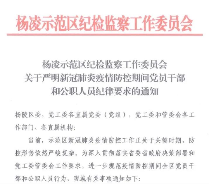“严禁聚餐聚会、严禁随意聚集、严禁特权思想、严禁消极懈怠、严禁制谣传谣。”3月15日,在示范区疫情防控工作的关键时期,示范区纪检监察工作委员会下发《关于严明新冠肺炎疫情防控期间党员干部和公职人员纪律要求的通知》,对全区党员干部和公职人员提出明确纪律要求,进一步夯实党员干部和公职人员率先垂范、带头落实疫情防控要求的自觉性和主动性,以铁的纪律维护良好的疫情防控秩序。
