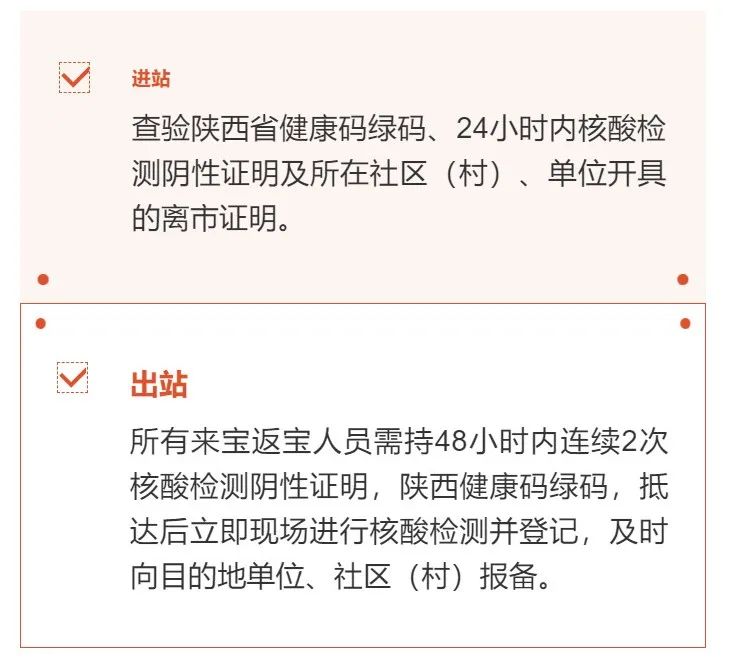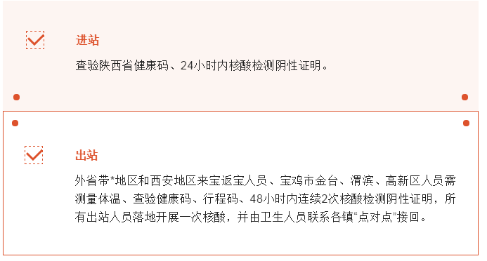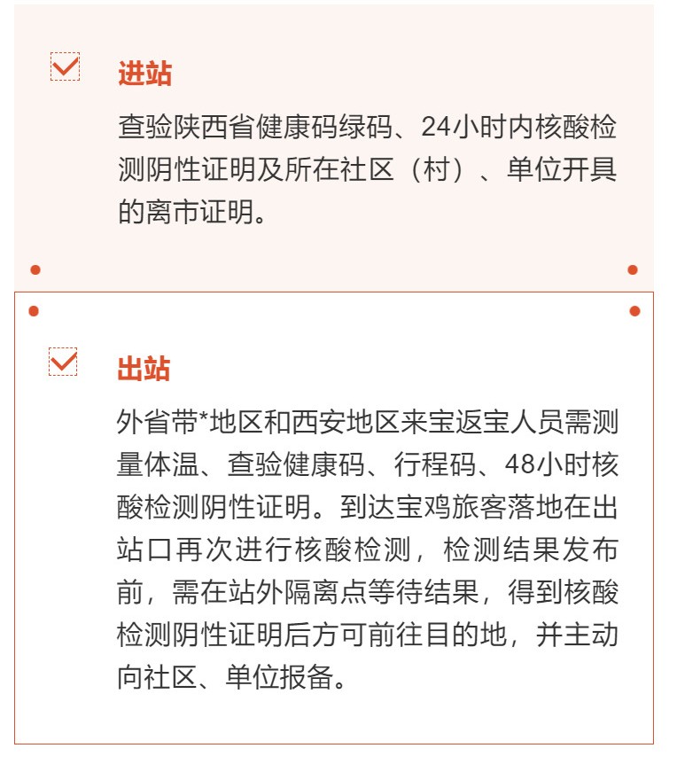 3月22日,记者从杨陵高铁站与火车站分别了解到,来杨人员仍需查验健康码、行程码,行程码带*号的(非中高风险地区)持48小时核酸检测阴性证明,身体无异常可正常通行。