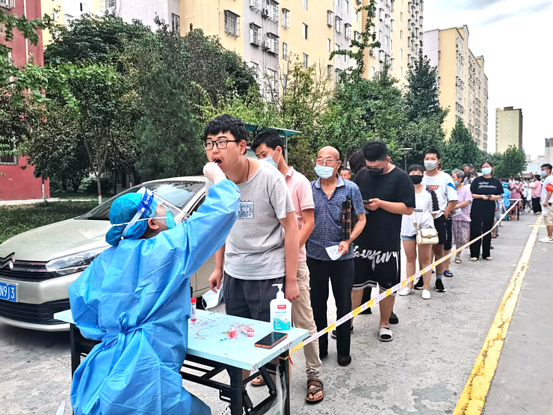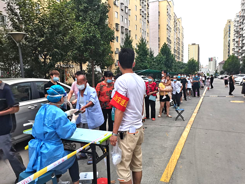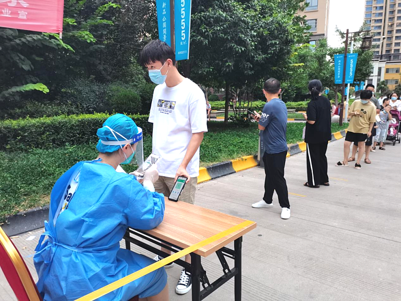 8月18日下午,在现场工作人员的提醒下,遍布在城区各小区的核酸检测点正在有序开展核酸检测。