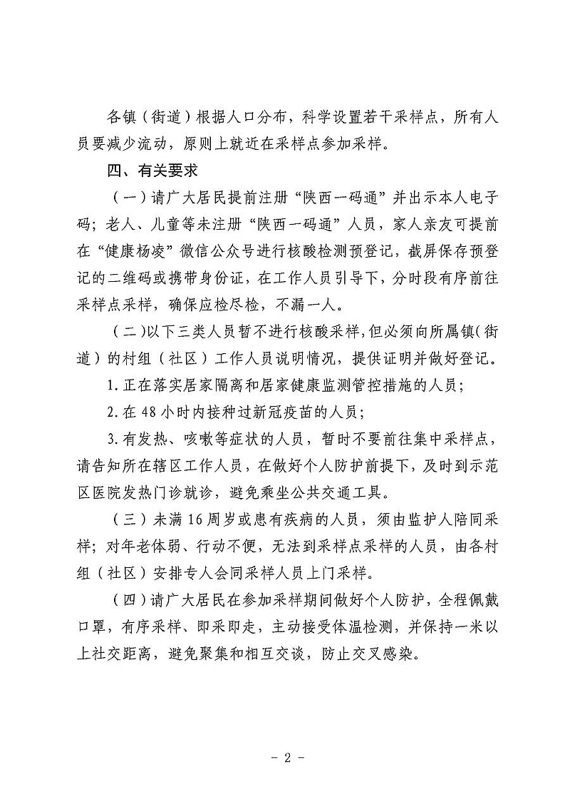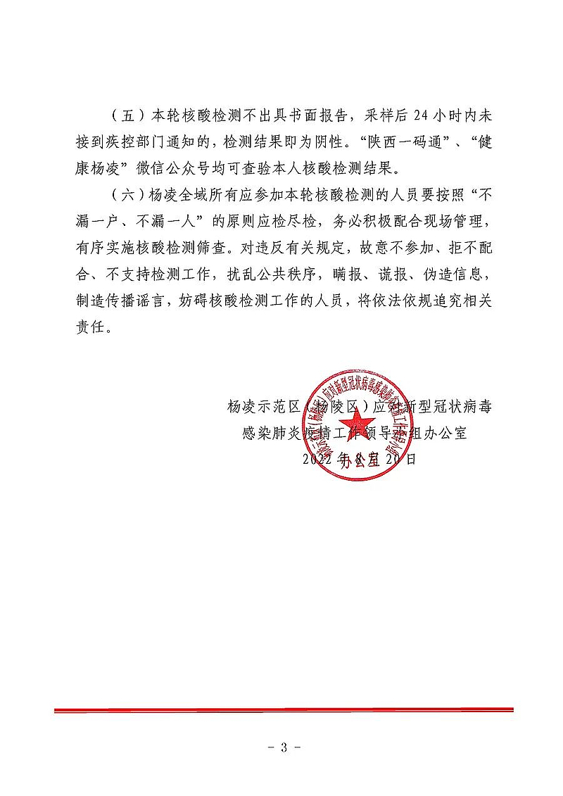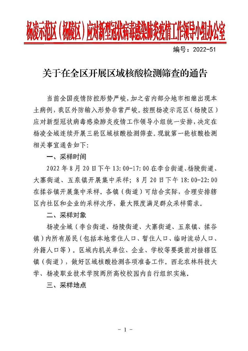 刚刚,杨凌示范区(杨陵区)应对新型冠状病毒感染肺炎疫情工作领导小组发布《关于在全区开展区域核酸检测筛查的通告》,决定在杨凌全域连续开展三轮区域核酸检测筛查。《通告》全文如下:
