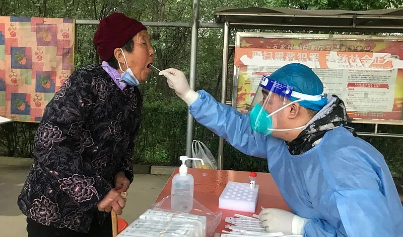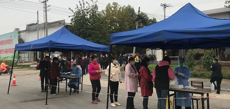 10月13日下午5点,记者来到杨陵区揉谷镇石家村,这里的村民正在有序排队,等待核酸检测。全村共设四个采样点,此时以老年人居多。