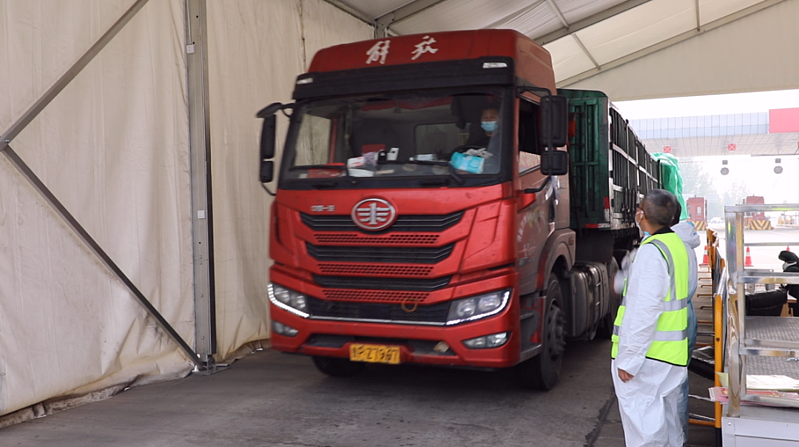 在杨凌东高速入口,工作人员正在引导货车司机有序通行。
