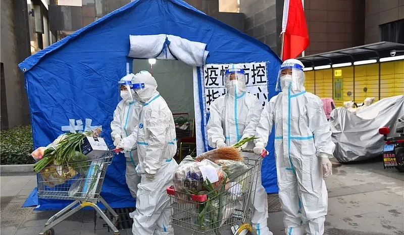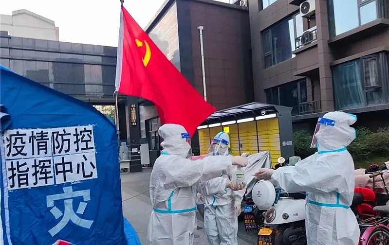 爱心守护,尽显企业担当;履职尽责,党员冲锋在前。在小区封控楼前,田园新都市临时党支部成员、李台街道办事处副主任季筱彤正带领5名街道办工作人员整理物资,准备送往封控人员家中。