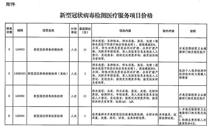 一、公立医疗机构开展的新冠病毒核酸检测单人单检价格(含检测试剂)每人次最高限价为15元;多人混检不分样本数量,每人次最高限价为3元(含检测试剂)。