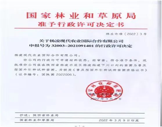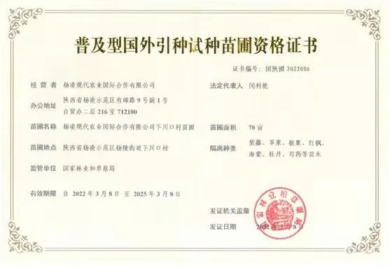 目前,杨凌现代农业国际合作有限公司先后办理了由国家林业和草原局颁发的《林木种子生产经营许可证》和《普及型国外引种试种苗圃资格证书》,正式具备进口苗木花卉隔离、繁育的资格。不仅如此,凭借资格证书还可以为苗木花卉企业代签外贸合同、引入国内到港清关、隔离试种等需求提供一站式服务。