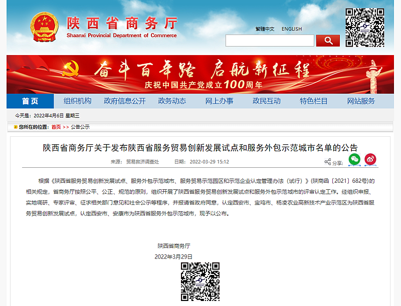 日前,省商务厅发布陕西省服务贸易创新发展试点和服务外包示范城市名单,认定西安市、宝鸡市、杨凌农业高新技术产业示范区为陕西省服务贸易创新发展试点,认定西安市、安康市为陕西省服务外包示范城市。