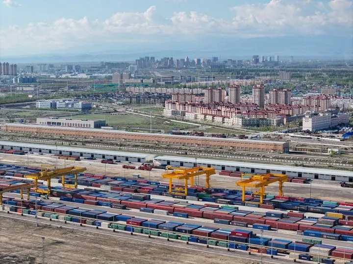 2023年5月12日,在哈萨克斯坦阿拉木图附近,货运列车驰骋于阿拉木图与中国霍尔果斯间(无人机照片)。新华社发(奥斯帕诺夫摄)