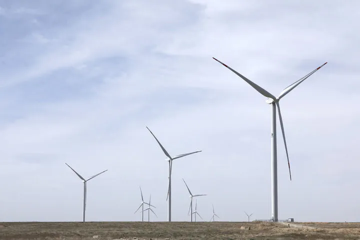 这是2023年4月3日在哈萨克斯坦札纳塔斯拍摄的札纳塔斯100兆瓦风电项目风机。新华社发(奥斯帕诺夫摄)