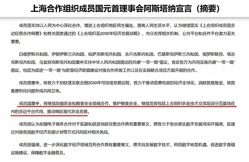 2024年7月4日,上海合作组织成员国领导人在哈萨克斯坦阿斯塔纳市举行元首理事会会议,并发表宣言。宣言中提到,将继续加强农业和粮食安全领域合作,维护粮食安全,继续发挥包括上合组织农业技术交流培训示范基地在内的多边平台作用,推动地区现代农业发展。