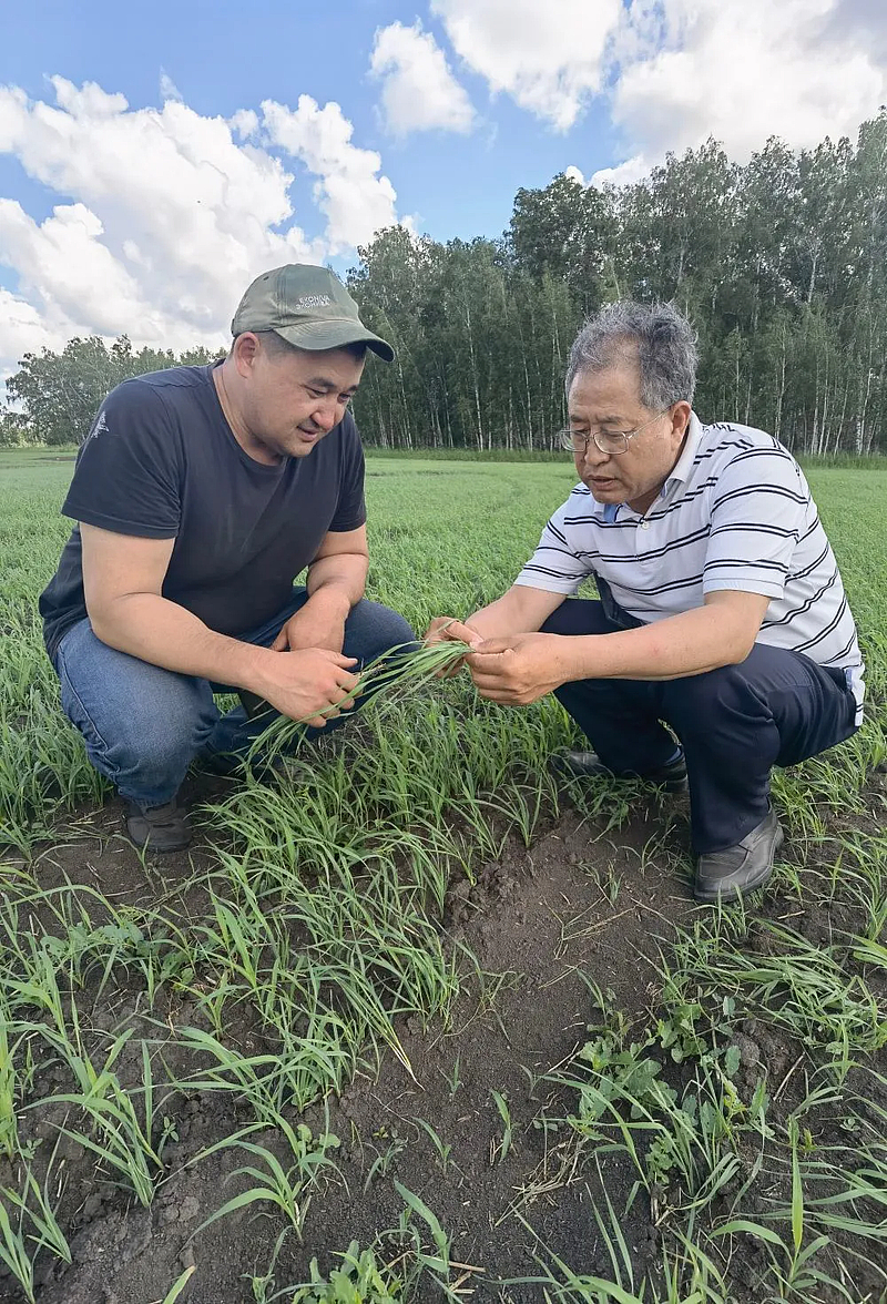 6月21日,西北农林科技大学张正茂教授(右)在哈萨克斯坦北哈州农业科技示范园与当地专家调查小麦苗情。