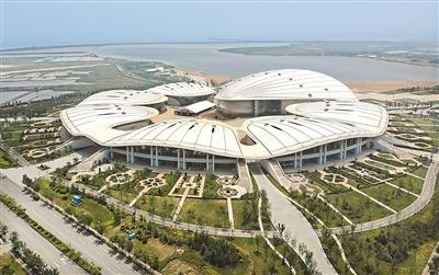 位于中国—上海合作组织地方经贸合作示范区的青岛·上合之珠国际博览中心(2024年7月18日摄,无人机照片)。
