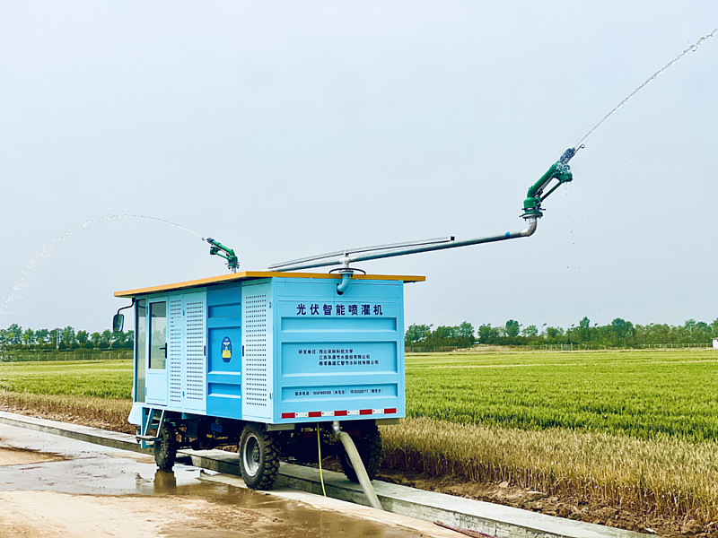 在杨凌良科新品种试验示范基地,光伏智能喷灌机正在演示作业。设备顶部光伏板,将太阳能转化为电能驱动运行,底部导航轮与渠道内壁贴合,实现“无人驾驶”自动行进。作业时,喷头喷洒出细密水雾,均匀覆盖农田,构建起高效的灌溉网络。