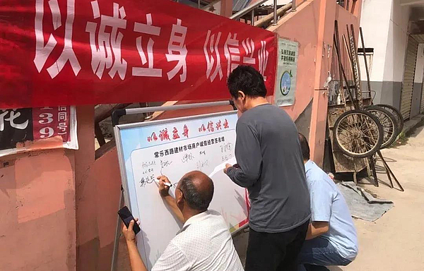 在常乐西路建材市场,志愿者们早早立好了商户诚信签名墙并积极走访,向商户们发放倡议书及诚信宣传册。烈日当头却丝毫没有影响建材市场商户们的热情,看到有签名墙,商户们纷纷拿过签字笔,欣然在墙上签下自己的名字。商户们纷纷表示要做诚信生意人,共同维护好建材市场的形象。