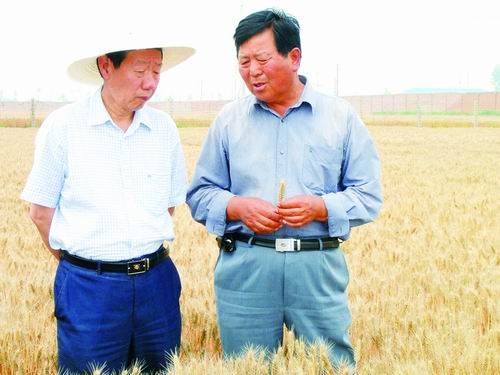 王辉(右)与西北农林科技大学原校长孙武学(左)交流小麦育种与良种推广问题。