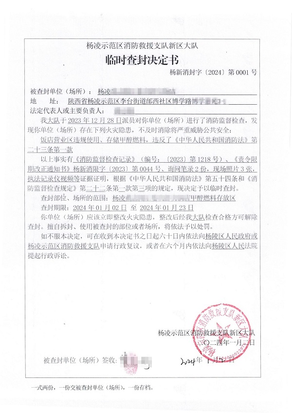 2023年12月28日,杨凌示范区救援支队新区大队对博学路一餐饮店进行消防监督检查,发现存在以下问题:一楼南侧营业区违规储存、使用甲醇。