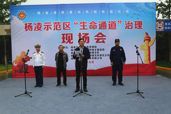 为全面贯彻落实关于集中开展打通“生命通道”攻坚行动要求,9月28日上午,杨凌消防支队在沁园春·居小区召开全区打通“生命通道”集中治理行动现场会。示范区安委办副主任、应急局副局长罗银军出席并讲话,消防支队政治委员郭连锋主持会议,副支队长史伟利、住建局住房物业管理中心副主任、房产处主任刘卫斌、各镇办、重点单位消防安全责任人,物业公司负责人等共计150余人参加会议。