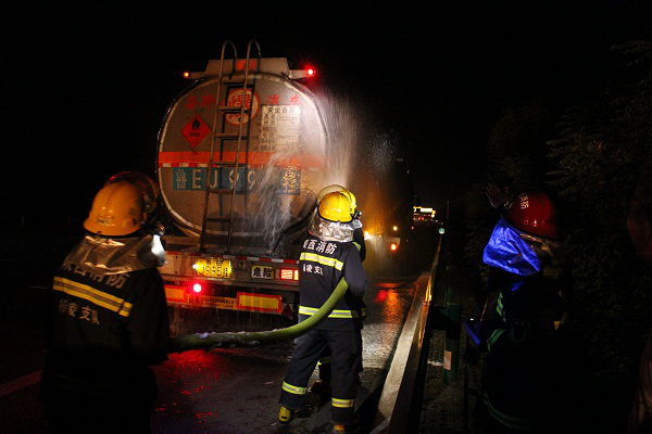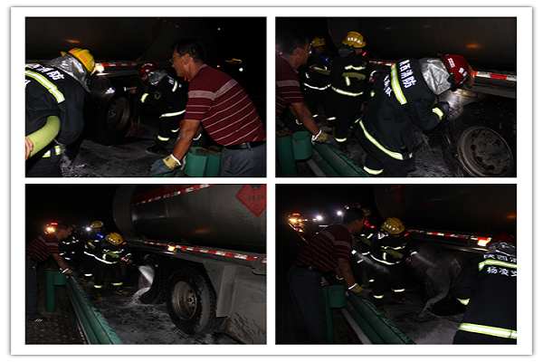 7月3日20时28分,杨凌消防救援支队指挥中心接到报警称:杨凌高速西口一辆汽油罐车轮胎自燃。指挥中心立即调派东新路特勤站3辆消防车15名指战员赶赴现场处置。