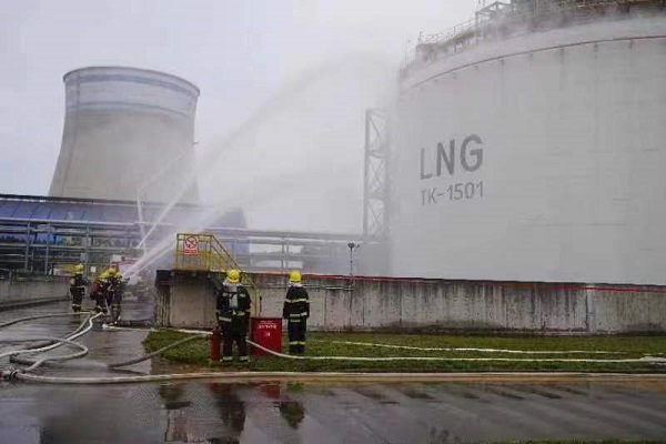 陕西液化天然气投资发展有限公司位于杨凌示范区渭惠东路35号,是集天然气预处理、液化及LNG存储、灌装、气化功能于一体的工厂。演练模拟:LNG储气站燃气泄漏,公司立即启动相关应急预案,组织站内员工及企业专职消防队立即开展处置,疏散周边人员,监测现场燃气浓度,保持警戒,开启消防喷淋系统、水炮等应急设施,并同时拨打119请求消防队伍支援。在演练现场,由消防队、戒备与疏散队、气体检测与安全队、救护队、抢险抢修队、物资队、工艺队组成的应急处置组逆行而上,应急、医疗等社会单位接到消息后迅速支援,经各方紧密协作,燃气浓度降低至安全范围,抢维修团队迅速进入展开抢修。抢修完成后,现场生产复原正常,连续约1小时的应急演练圆满结束。