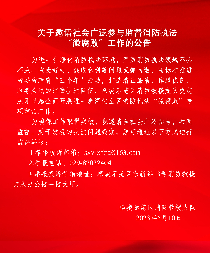 杨凌示范区消防救援支队发布《关于邀请社会广泛参与监督消防执法”微腐败“工作》的公告