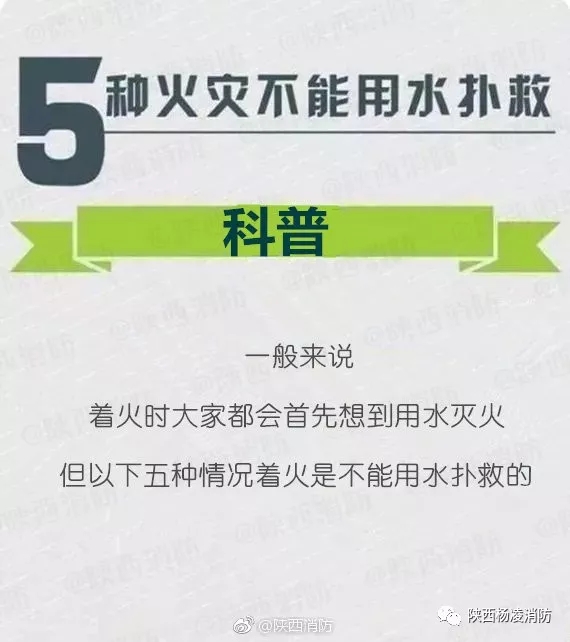 水火不相容,对于灭火而言,水的重要性是不言而喻的。着火时大家都会首先想到用水来灭火,然而,并不是所有的火灾都可以用水来扑灭。在此总结了5种绝对不能用水扑灭的火灾。一起来了解一下吧!