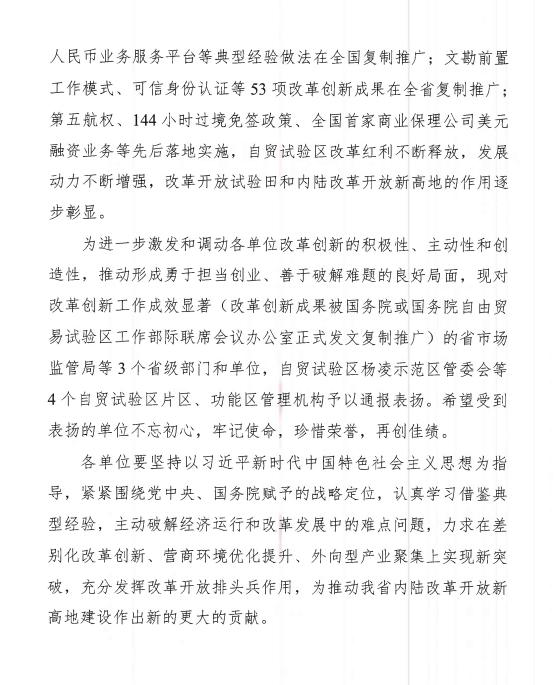 通报指出:自2017年4月1日陕西自贸试验区揭牌运行以来,在省委、省政府坚强领导下,省级各有关部门和单位以及自贸试验区各片区、功能区管理机构坚持以习近平新时代中国特色社会主义思想为指导,认真贯彻落实党中央、国务院关于自贸试验区建设的决策部署和省委省政府工作安排,突出差别化改革,推进制度创新,自贸试验区建设取得新成效。三年来,累计形成创新案例370个。