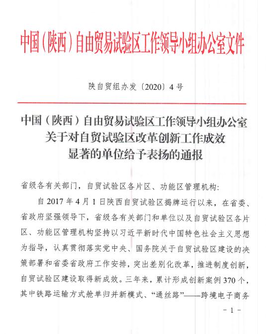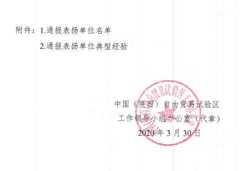 3月30日,陕西省自贸办印发《关于对陕西省自贸试验区改革创新工作成效显著的单位给予表扬的通报》,杨凌自贸片区等四个片区和陕西省市场监管局等三个省级部门单位名列其中。