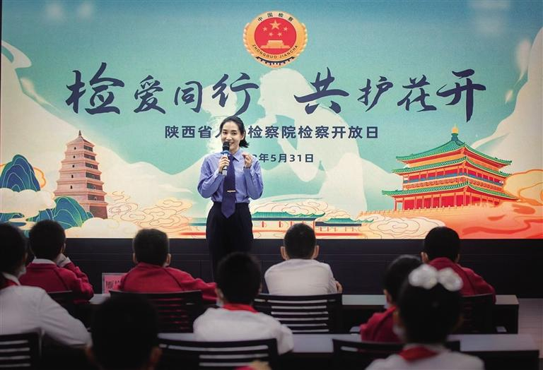 陕西省人民检察院在西安市雁塔区人民检察院举办“检爱同行 共护花开”检察开放日活动。图为检察官张洋与孩子们互动(资料照片)。 受访单位供图