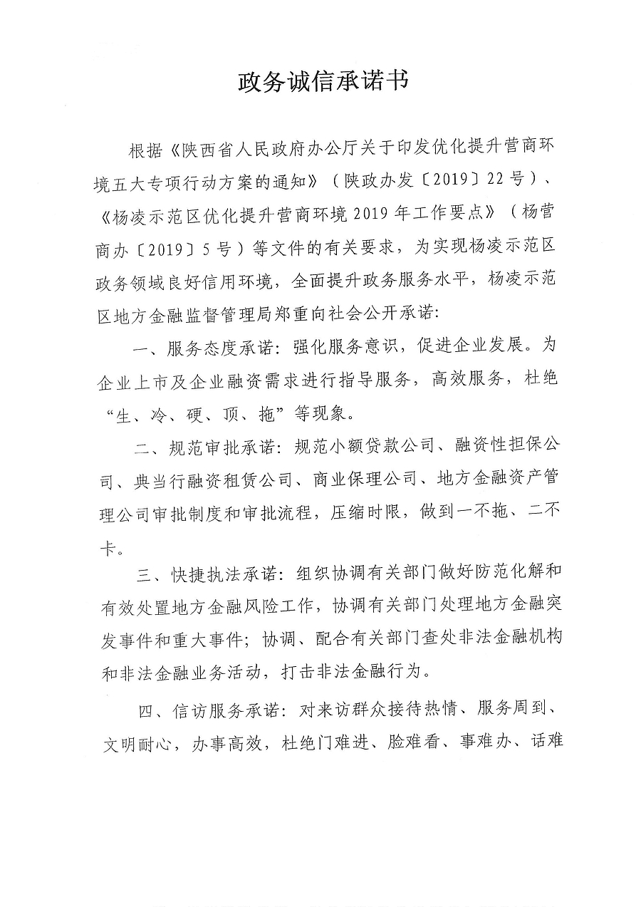 杨凌示范区地方金融监督管理局政务诚信承诺书