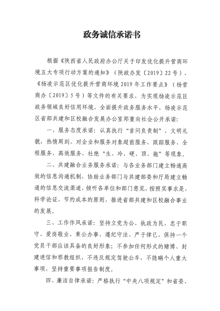 杨凌示范区省部共建和区校融合发展办公室政务诚信承诺书