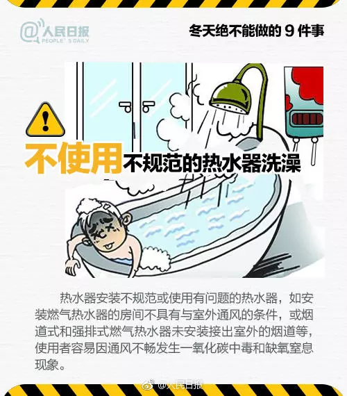 据报道,入冬以来,全国发生了多例因不规范使用燃气热水器导致的一氧化碳中毒事故。洗澡时不注意通风,在开着暖风的车内睡觉,电暖气上盖衣服…这些不起眼的“小事”,稍不注意就可能酿成大祸!冬天别做这九件事,不可不知的安全提醒,转给身边人!
