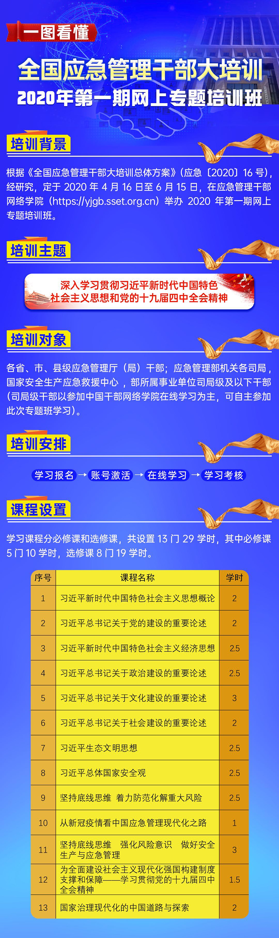此次网上专题培训班主题为深入学习贯彻习近平新时代中国特色社会主义思想和党的十九届四中全会精神,培训内容包括习近平新时代中国特色社会主义思想,党的十九届四中全会精神,从抗击疫情看待推进国家治理体系和治理能力现代化等,共设置课程13门29学时。
