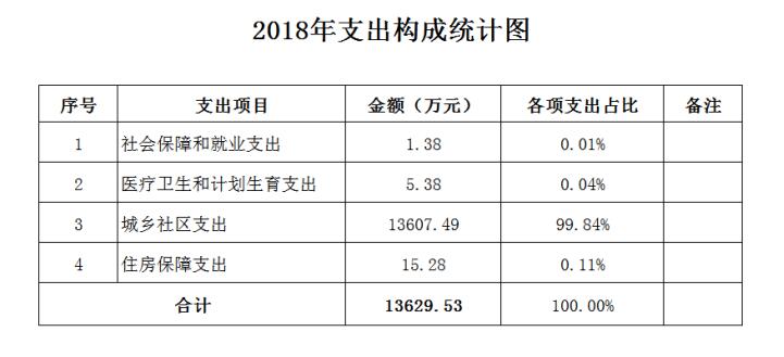 2018年度一般公共预算财政拨款支出170.78万元。按功能分类科目分,包括社会保障和就业支出1.38万元,其中人员经费支出为1.38万元,公用经费支出为0;医疗卫生与计划生育支出为5.38万元,其中人员经费支出为5.38万元,公用经费支出为0;城乡社区支出为148.75万元,其中人员经费支出为122.41万元,公用经费支出为26.33万元;住房保障支出为15.28万元,其中人员经费支出为15.28万元,公用经费支出为0。比2017年度一般公共预算财政拨款支出169.23万元增加了1.55万元。