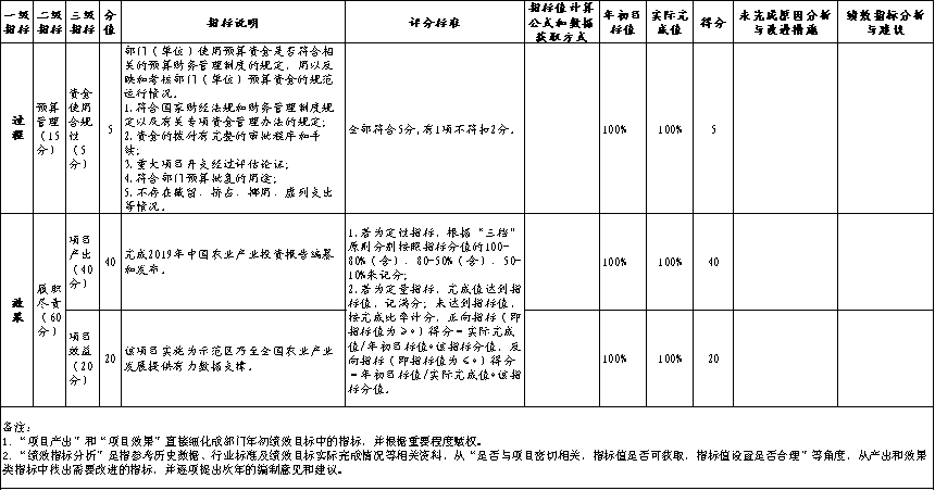 2019年农业投资报告项目绩效自评综述:根据年初设定的绩效目标,项目自评得分100分。项目全年预算数30万元,执行数30万元,完成预算的100%。主要产出和效果:该项目实施为示范区乃至全国农业产业发展提供有力数据支撑。