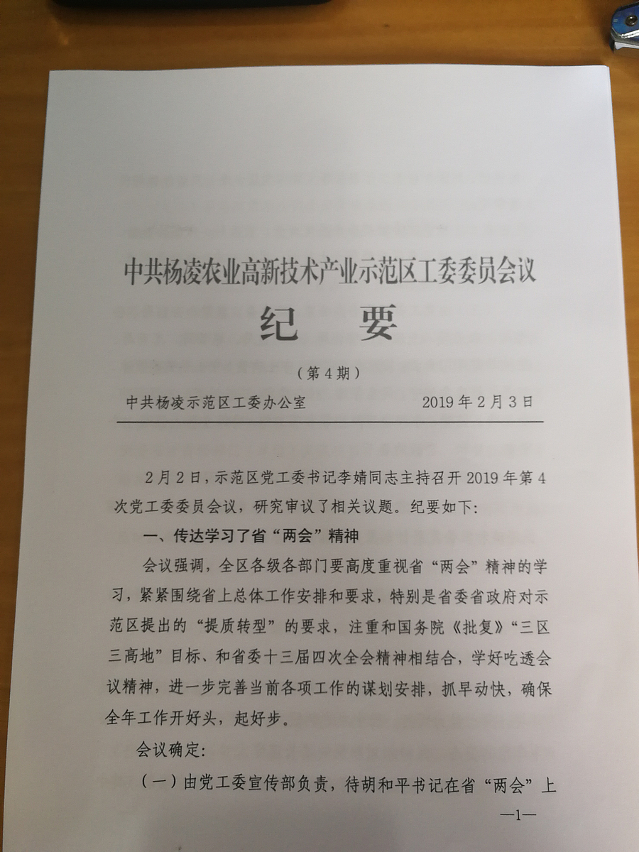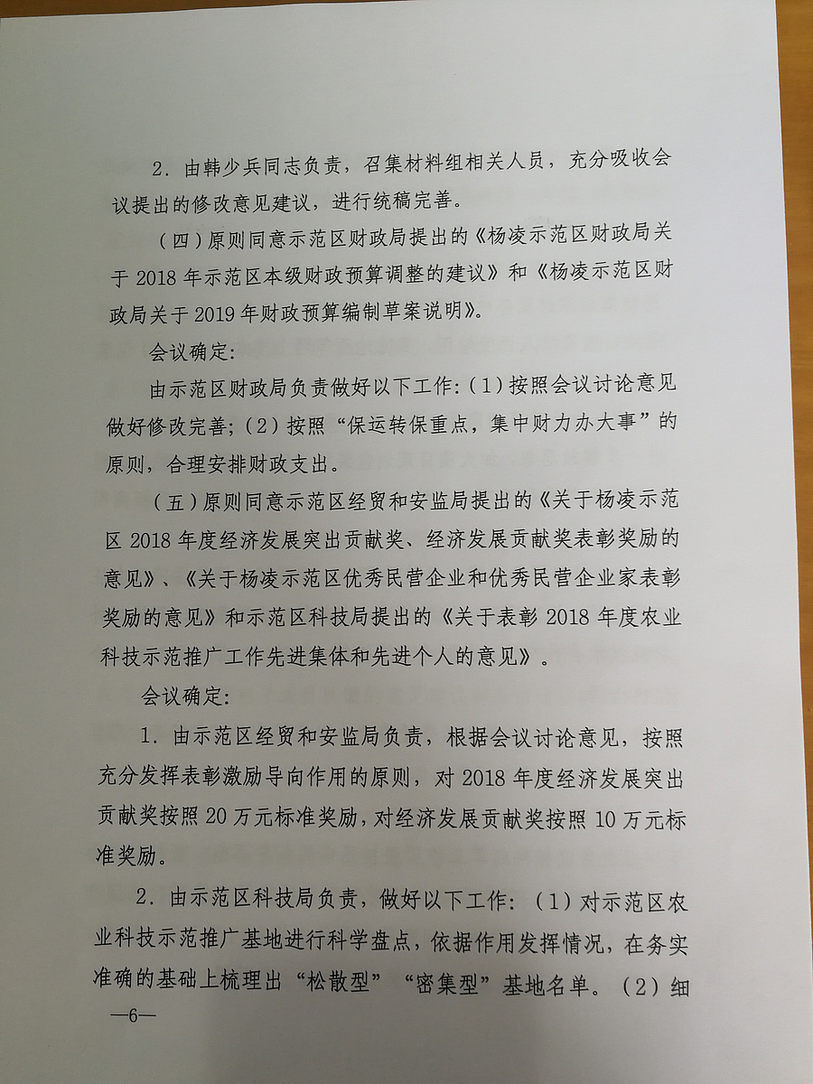 杨凌示范区工委委员会议纪要(第四期 含2019年预算草案事项)