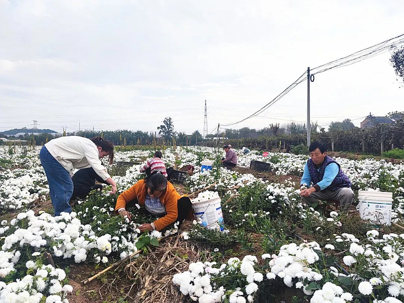 一朵小菊花,带来大收益。除了增加村集体收入,进入采收期后,基地里每天都有三四十人来采摘菊花,也为村里的闲散劳动力带来了务工收入。