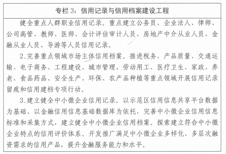 1.健全信用制度规范。依据中省相关法规规章,完善配套政策措施,健全信用信息归集共享、信用监管、守信激励与失信约束、信用修复、信用主体权益保护等方面规章制度,为推动示范区信用体系建设依法合规发展打下坚实基础。
