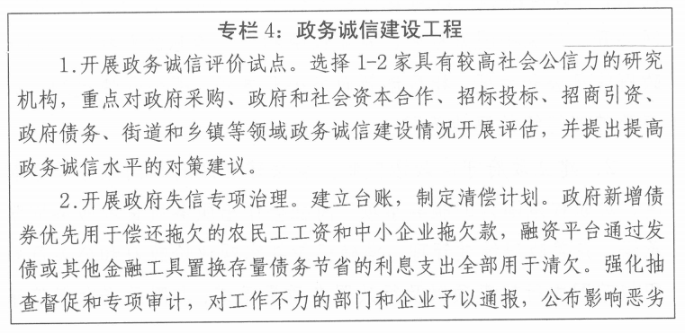 4.深入开展政府失信治理。建立健全“政府承诺+社会监督+失信问责”机制,广泛开展群众监督和舆论监督。建立完善政务失信治理工作协调机制,在政府采购、招标投标、招商引资、地方政府债务、街道和乡镇政务等,将政务公开内容不实、不兑现服务承诺、违规使用财政资金、拖欠民营企业账款、突破行政权力边界等失信行为记录失信档案,对造成政务失信行为的部门负责人依法依规追究责任。