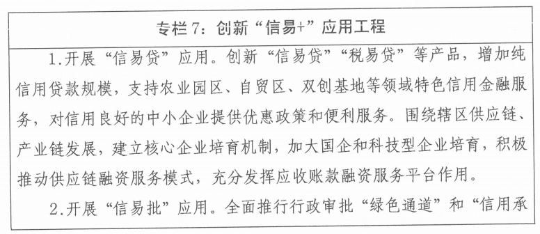 一一信用应用场景持续增加。创新“信易+”应用场景,推进信用评价结果应用。通过加大纯信用贷款支持中小企业健康发展,加大对农业经营主体的信用贷款支持,助力乡村振兴,推动农业合作领域的信用创新。