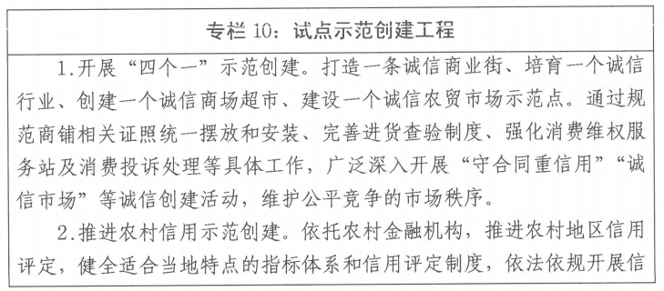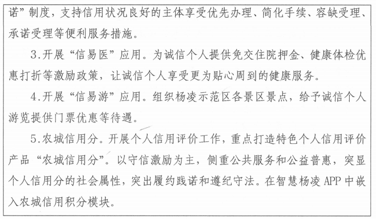 ——坚持示范引领打造特色。结合自贸试验片区,杨凌农高会等战略机遇与特色,在农业技术、产业、人文等领域开展社会信用体系建设试点,打造社会信用体系建设示范工程。