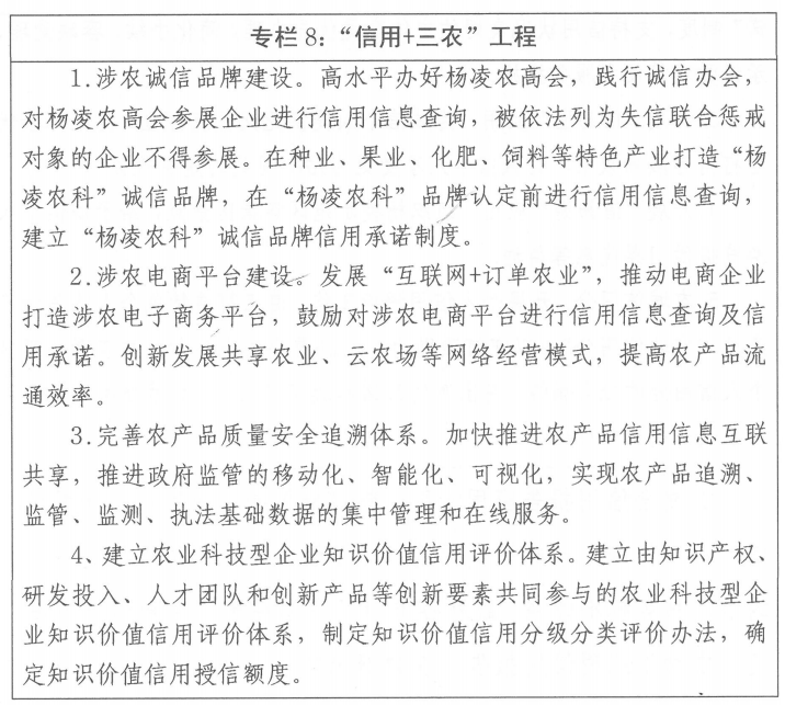 ——信用数字经济蓬勃发展。强化信用数字农业技术创新,培育具有农业特色的信用数字产业集群,利用信用数字推动杨凌智慧农业创新中心建设。推进“一带一路”信用数字农业国际合作,打造具有国际影响力的农业数字经济创新示范区。