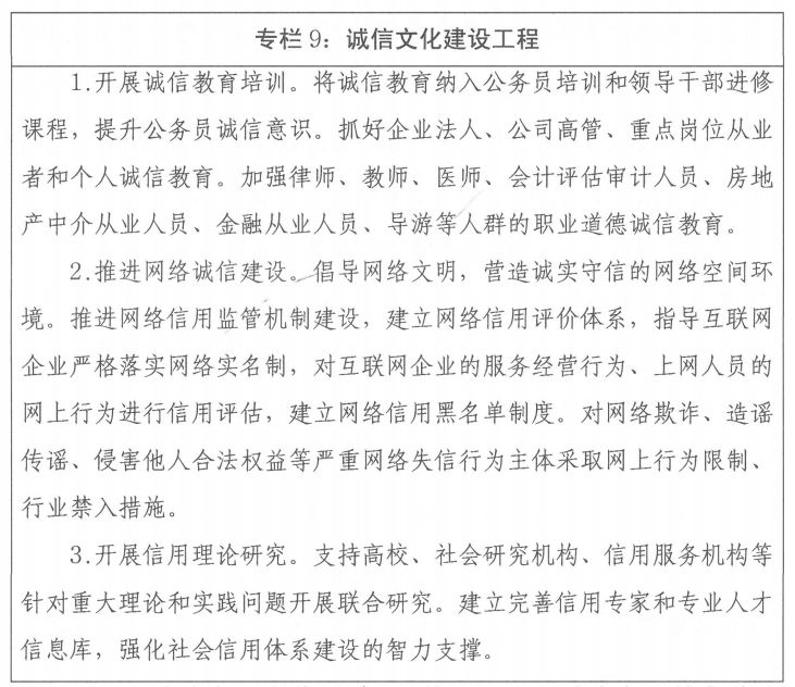 1.加强诚信文化教育培训。建立涵盖基础教育、高等教育和职业教育的诚信文化教育体系,构建诚信文化教育长效机制。将诚实守信作为社会公德、职业道德、家庭美德和个人品德教育的重要内容。加强信用理论研究和实践,创新诚信教育形式,通过在线教学、多媒体宣传、现场讲学等方式开展诚信教育,促进信用经验交流。加强对基层和一线监管人员的信用理论和实践工作指导和培训。