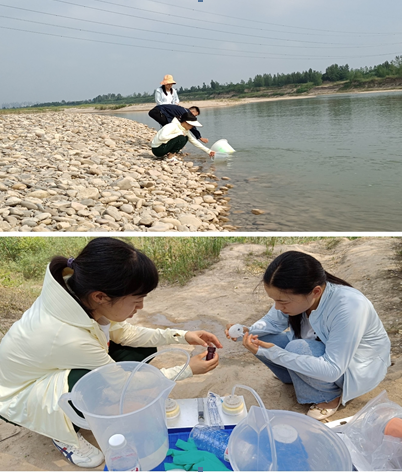【中午10:00 渭河出杨凌断面河道边。】由贾娟丽、张亮亮和耿小辉三名同志组成的采样组,正在紧张有序的开展第三季度eDNA样品采集工作。此时的太阳异常炙热,地表温度高达40℃,该点位没有任何遮挡,烈日炙烤下开展采样工作,从河道取样沉降、采样器消毒、抽滤制样、样品固定,每一道工序都严格按照监测方案进行,认真严谨。整个制样过程持续了2个多小时,三名同志的汗水早已经湿透了衣衫。