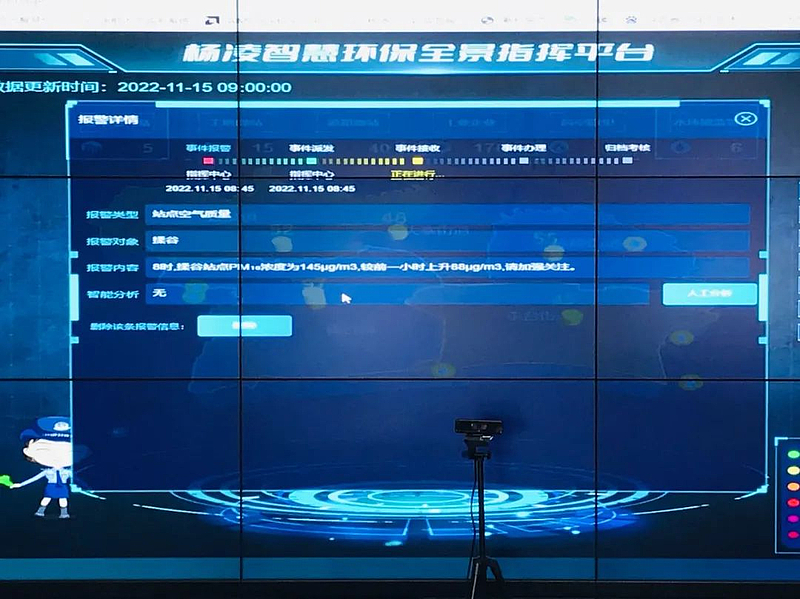 走进杨凌示范区智慧环保指挥中心,大屏幕上的“地图”实时显示着杨凌最新的空气质量、水环境质量、企业用电量、扬尘、机动车尾气、秸秆燃烧等监测数据。工作人员坐在指挥中心,实时关注杨凌全域的环境质量状况。根据报警信息,计算机后台根据特征污染物,结合微型站、走航车、无人机、激光雷达、瞭望视频等多源数据进行运算分析,确定疑似污染源,并自动推送执法检查任务。